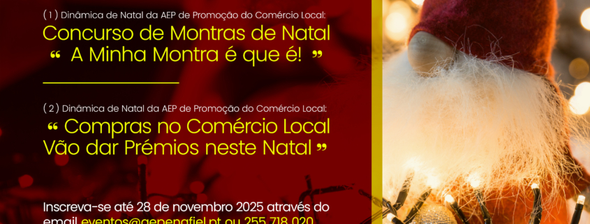 Em caso de pretender participar nestas iniciativas, a sua candidatura deve ser apresentada até ao próximo dia 28 de novembro de 2025 através do envio de um email (em resposta a este email ou eventos@aepenafiel.pt) indicando para tal a vontade de participar, sendo que deverá indicar se pretender participar nas duas iniciativas (1 e 2) ou indicar apenas a iniciativa que pretende participar (1 ou 2), juntamente com os dados do estabelecimento (nome do estabelecimento + nome do responsável + morada + contactos). No caso de participar no Concurso de Montras de Natal deverá também enviar fotografia da montra a concurso até ao fecho das inscrições